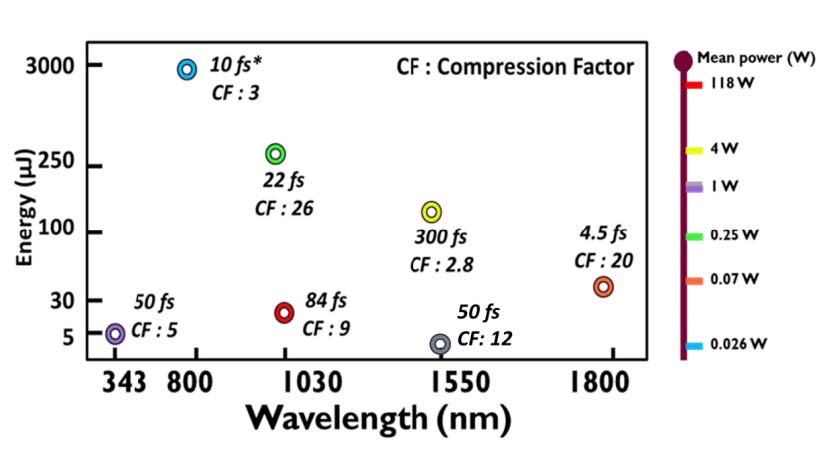 输入激光 压缩输出 性能 λ0 (nm) Δλ (μm) 输入脉冲能量 (μJ) Δτ (fs) 平均功率 (W) λ0 (nm) Δλ(1) (μm) E (μJ) Δτ (fs) 压缩比 频谱 展宽率 343 1.2 4.5 250 1 343 23.5 2.5 50 5 20 800 60 2600 30 0.07 775 160 1300 10(2) 3 2.6 1030 3 100-1000 600 0.1-1 1050-1080 1030-1100 80-650 50 12 23 1.6 16.8 740 118 1030 30 15.8 84 9 19 3 158 600 0.158 1030-1040 30 126 22 27 10 1.7 46 350 46 1030 >40 38.8 29 12 >24 1.7 46 360 9.2 1030 >55 38 27 13 >32 2.4 46.5 436 93 1030 >60 43 45 9 >25 1550 15 105 85 4.2 1550 50 78 300 2.8 3.3 1.6 2.5 600 1.65 1550 80 1.6 50 12 40 1800 80 35 80 0.07 2000(3) 1000-2000 28 4.5 20 15