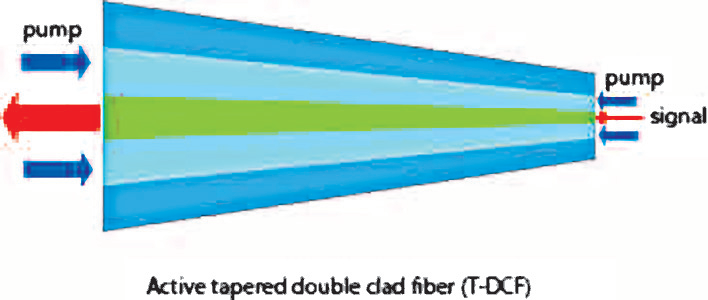 T-DCF 是一种纤芯掺杂稀土元素(Yb、Er、Tm 等)的光纤,它被用作高功率放大器(CW和脉冲)中的增益元件。T-DCF 的纤芯和包层直径沿长度平滑变化。通常选择核心参数(直径和数值孔径),使得基模仅在 T-DCF 的狭窄部分得到支持。