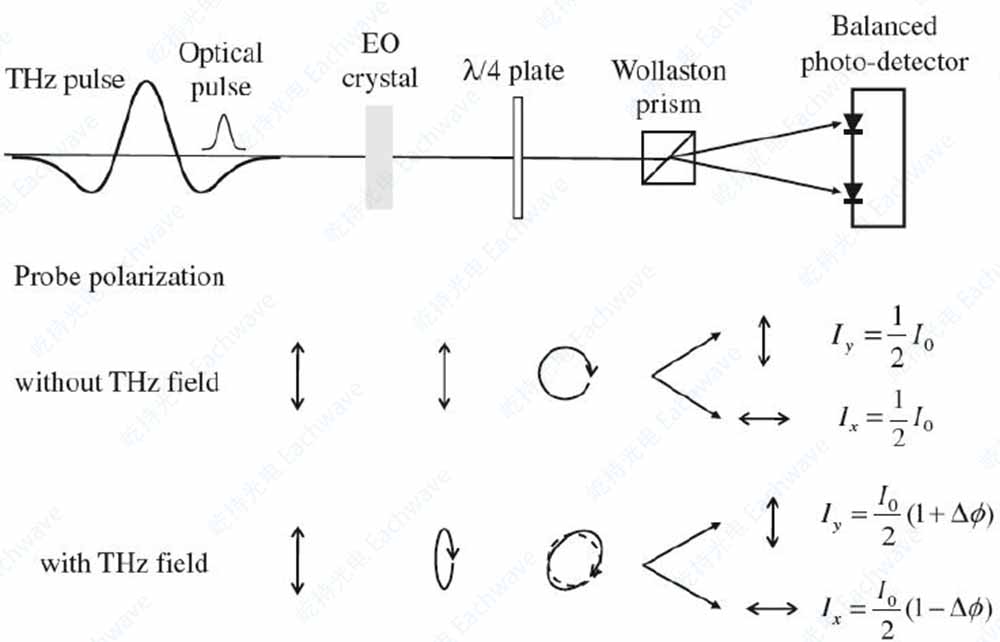 当探测光脉冲和THz脉冲共线地入射到电光晶体上,入射的THz脉冲通过Pockels效应引起晶体的双折射,在晶体中产生的双折射使探测脉冲的偏振方间发生偏转,光电探测器探测到的强度差与THz脉冲的场强成比例,从而探测到THz波形。由于THz的脉冲宽度(几个皮秒)远大于探测激光脉冲的脉宽(几十飞秒),则THz电场可被近似的看作一直流偏置电场,因此,通过改变THz脉冲与光探测脉冲间的时间延迟,就可得到THz脉冲的整个时间波形。