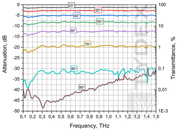 图 2.衰减器的典型校准曲线与检偏器的旋转角度的关系。使用 Menlo Systems K-8 脉冲太赫兹光谱仪测量。(a – 微波,b – 太赫兹,с – 红外-太赫兹)。