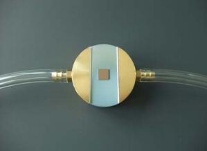 ?芯片尺寸4.0 mm x 4.0 mm,焊接在水冷铜散热片上,直径25.0 mm