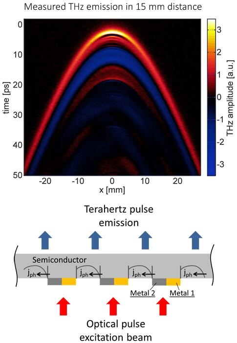 太赫兹激发方案: 太赫兹辐射过程基于肖特基场在非对称的金属-半导体连接点引发的光电流