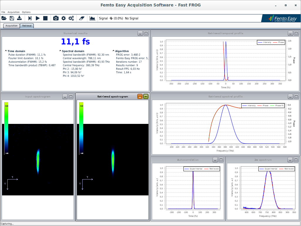 我们提供两种FROG: 1,Fast-FROG :单次FROG,用于低重频脉冲宽度测量。其创新的算法允许实时脉冲检测。 2,MS-FROG:多次FROG,它使用光学延迟线扫描延迟,每个脉冲都允许知道特定延迟的强度。它可以测量能量低至50pJ的脉冲。同一设备可以测量从5 fs到80 ps的短脉冲和长脉冲!