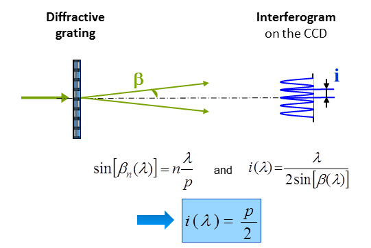 干涉和衍射相结合抵消了波长因子,干涉条纹间距与光栅间距完全相等。适应于不多波长光学测量且不需要重复校准,