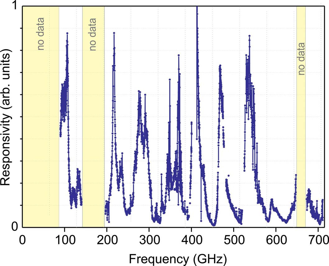 Terasense的超快太赫兹探测器可以在一个很宽的频谱范围内都有响应,不过它的频谱响应曲线不是连续的,而是由多个响应带组成。值得注意的是,响应曲线中的响应带峰值可以根据客户的实际需要而在生产过程中进行调谐。
