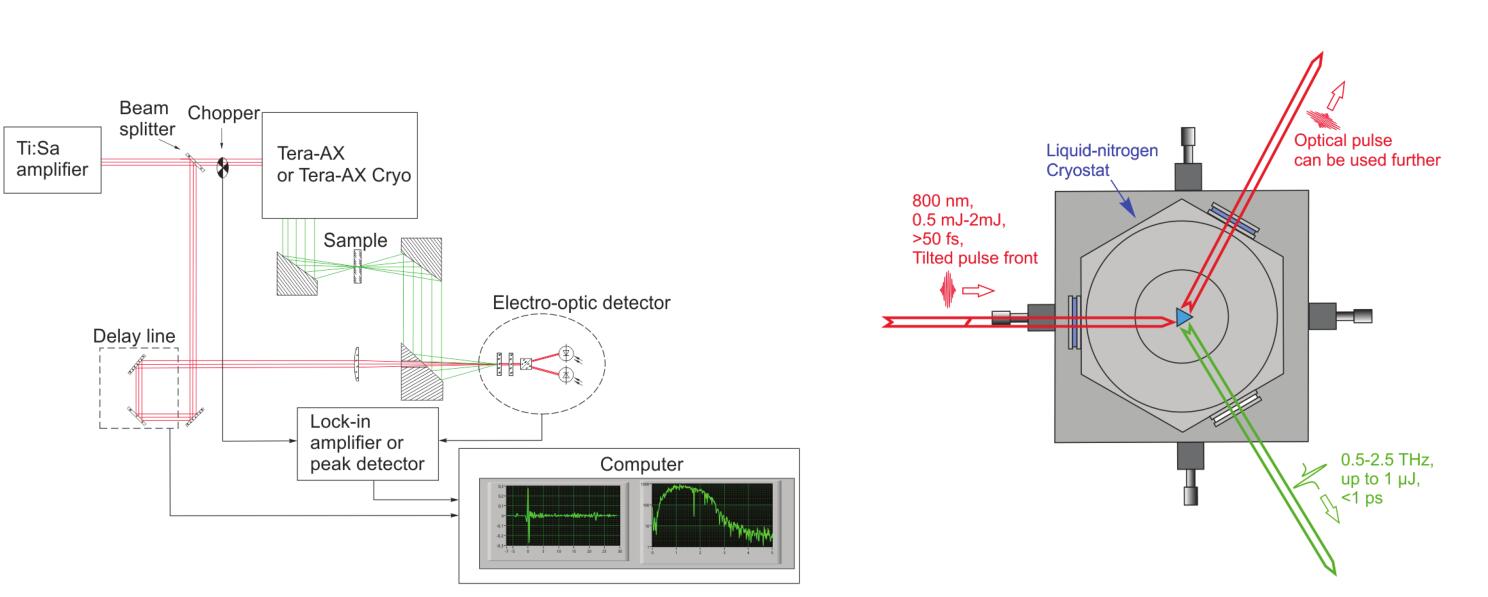 - Tera-AX光学组件基于掺镁铌酸锂晶体MgO:LiNbO3光学整流原理产生THz辐射,利用抛物净收集输出THz光束