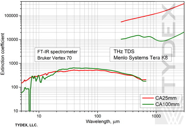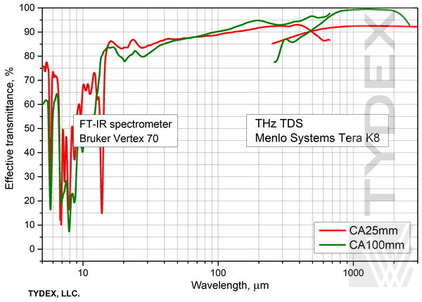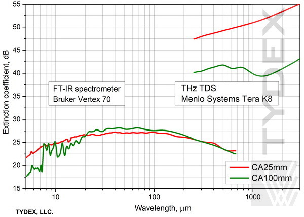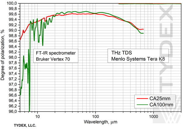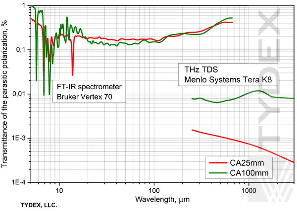 上面的曲线表明我们的太赫兹偏振片在非常宽的波长范围内具有出色的质量。请注意,实际测量结果可能与上述值不同,具体取决于光谱仪类型和测量模式。