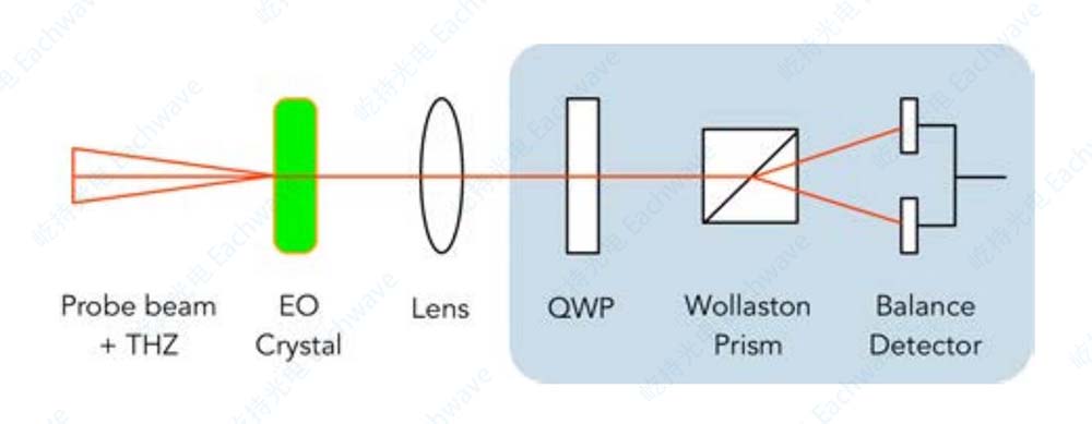 当探测光脉冲和THz脉冲共线地入射到电光晶体上,入射的THz脉冲通过Pockels效应引起晶体的双折射,在晶体中产生的双折射使探测脉冲的偏振方间发生偏转,光电探测器探测到的强度差与THz脉冲的场强成比例,从而探测到THz波形。由于THz的脉冲宽度(几个皮秒)远大于探测激光脉冲的脉宽(几十飞秒),则THz电场可被近似的看作一直流偏置电场,因此,通过改变THz脉冲与光探测脉冲间的时间延迟,就可得到THz脉冲的整个时间波形。