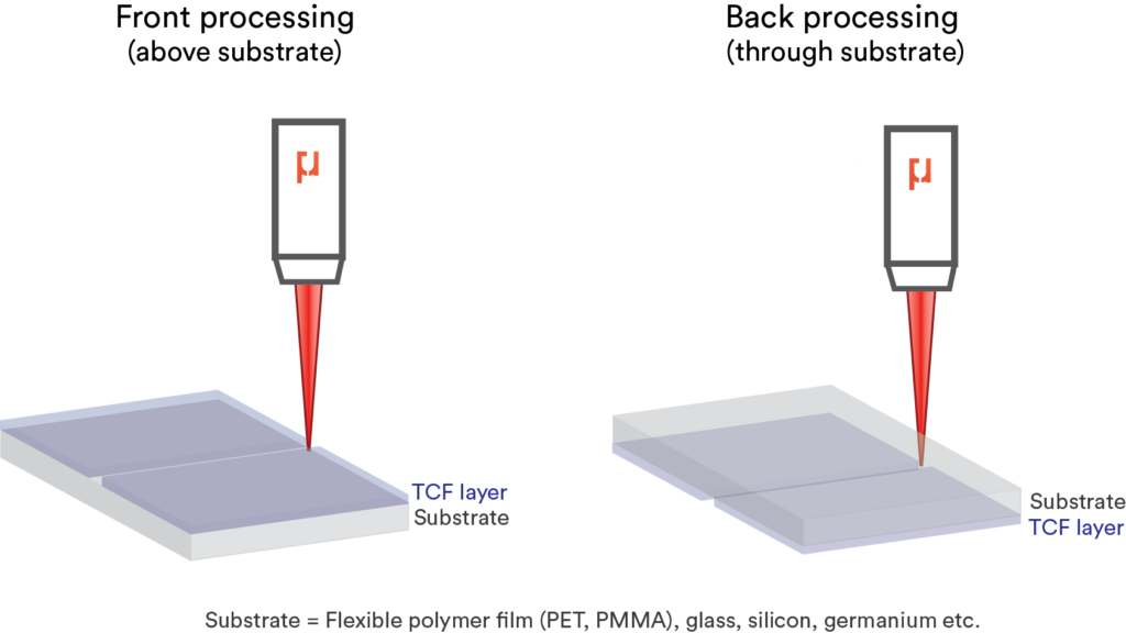 当涉及到TCF的激光图案化时,最大的挑战之一是能够选择性地去除薄膜而不影响下面的基板(玻璃、聚合物、硅等)。根据沉积工艺或应用,最好去除基材上方的TCF层(前处理)或通过基材(后处理),如图2所示。