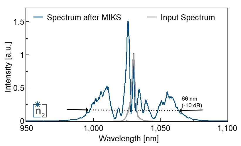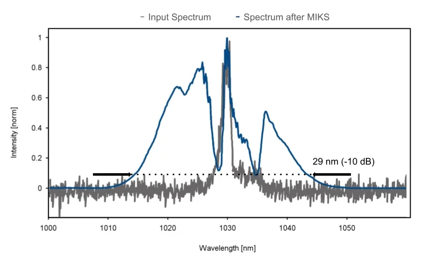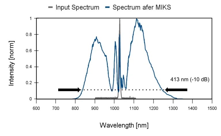 在这里,我们展示了由硬质合金飞秒激光器泵浦驱动 MIKS1_S 模块的性能。峰值功率可增加 4 倍,效率可达 95%。自相位调制频谱和脉冲压缩如下图所示。