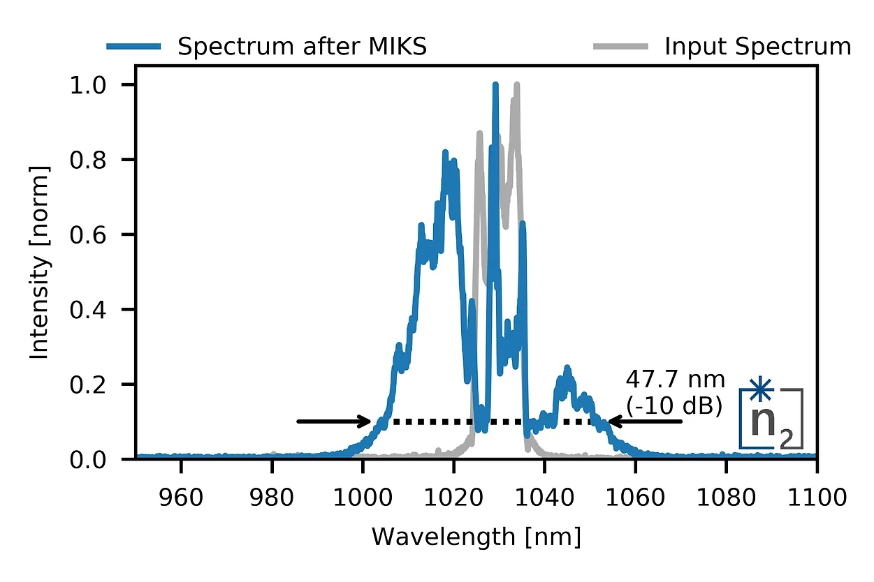 下面我们介绍从我们的 MIKS1_S 模块获得的结果,该模块由 Dira 200-100 飞秒激光器泵浦驱动。我们成功地将峰值功率显着提高了 11 倍以上,同时保持了超过 95% 的令人印象深刻的效率。下图说明了通过我们的实验实现的自相位调制频谱和脉冲压缩。