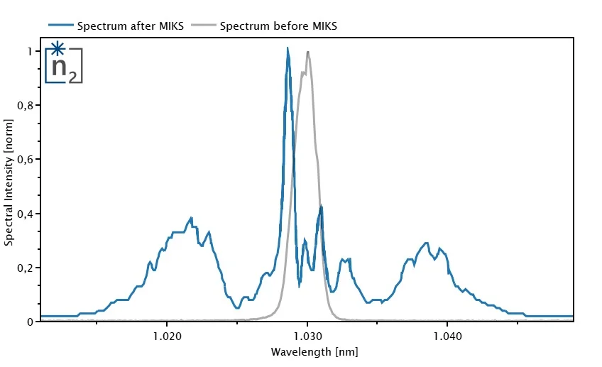 在这里,我们展示了由 neoLASE neoMOS SMAARTlaser 飞秒激光器泵浦驱动MIKS1_S 模块的性能。峰值功率可提高七倍,效率超过 90%。自相位调制频谱和脉冲压缩如下图所示。