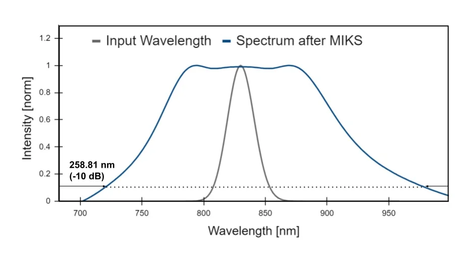 这里我们展示了由 TruMicro2030 光纤飞秒激光器泵浦驱动MIKS1_S 模块的性能。通过将带宽增加到 45 nm 以上,可以实现 52 fs 的脉冲持续时间,并超过 90% 的传输率。