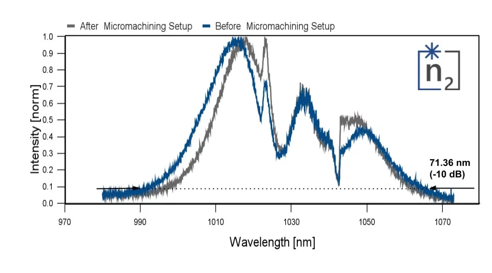 最重要的是,我们补偿了微加工装置中的光学器件引入的额外色散。这样我们就可以在实际工件上实现低于 100 fs 的脉冲持续时间。
