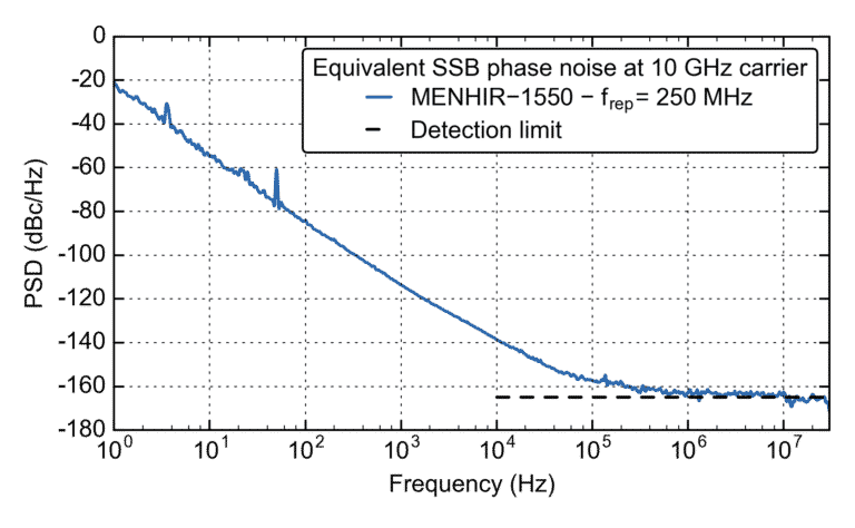 Menhir Photonics提供锁模激光器,具有当今市场上最低的相位噪声和极高可靠性。图1显示了menhir-1550系列自激激光器的典型相位噪声测量,在10GHz载波上测量,即40次谐波(250MHz脉冲重复率)。请注意,测量的本底噪声将集成时间抖动限制为大约500 as(阿秒)。