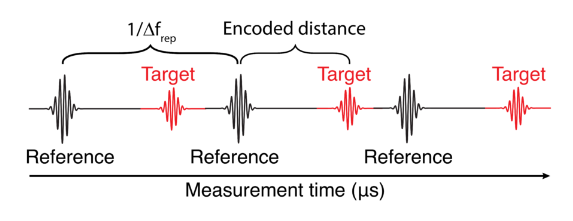 双光梳激光雷达中的测距信号图示。距离测量每1/Δfrep重复一次。