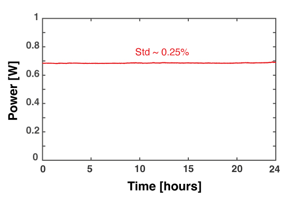 该激光器包含专有光纤组件和坚固的自由空间架构,可确保卓越的长期稳定性。图显示了激光器在中心波长 3400 nm 下工作时的 24 小时平均功率测量结果。