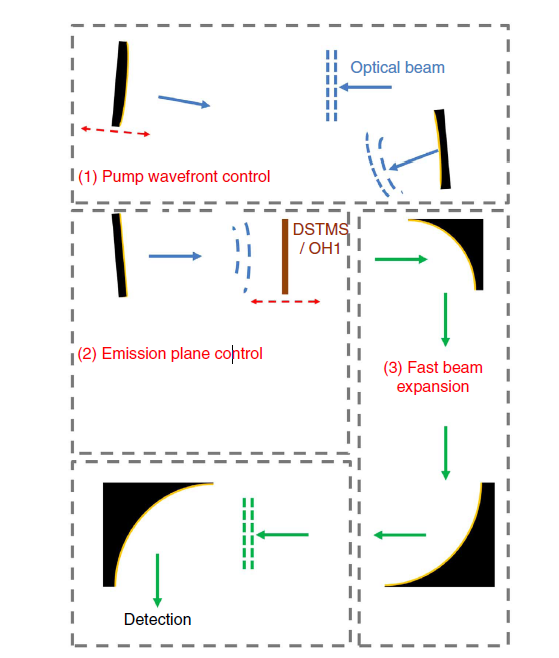 对于我们的THz光源,我们使用一个脉冲持续时间为65 fs的光学参量放大器(OPA)系统,在1.5μm和1.35 μm波长下泵浦小型有机晶体DSTMS和OH1(详见方法)。在该方案中,在THz发射有机晶体位置泵浦通量保持恒定,采用全反射式望远镜组件调整泵浦光束的球面波前曲率。有机晶体极好地适合于太赫兹为他们提供相位匹配太赫兹在1-5 THz范围(没有无机晶体被证明高效的),一个非常高的二阶非线性光学敏感性和240 pmV-1和高损伤阈值(见方法部分更多的细节)。