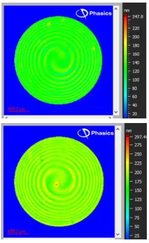 Phasics的QWLSI技术不会受到偏振的影响,因此在从右旋圆偏振切换到左旋圆偏振时,我们的设备仍然可以对波前进行详细表征。图2展示了波前曲率的变化。此外,可以通过滤掉主要的波前曲率来揭示残余波前误差,这些误差反映了更高空间频率的缺陷(见图2中间的左侧相位图)。