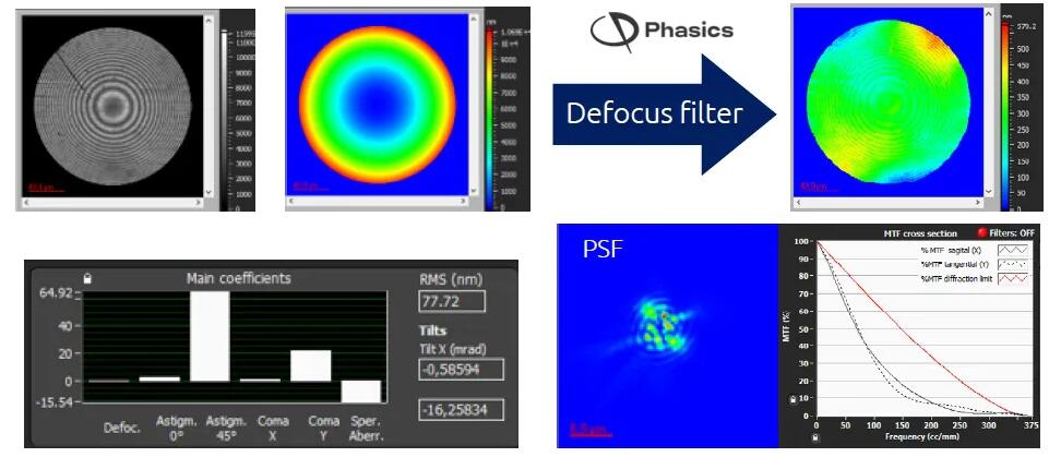 在图4中,我们对一个PB金属透镜进行了测量。Phasics的SID4-HR波前传感器的高动态范围能够同时捕捉主要波前曲率,并通过像差过滤显示所需要的光学像差。