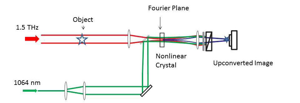 图1所示。实验图显示了THz非线性成像装置。THz辐射入射到一个物体上(“物体”) 然后聚焦到一个位于傅里叶变换平面上的非线性晶体中。在1064nm处的红外光谱结束与晶体中的太赫兹光重叠,将太赫兹图像的空间频率向上转换到中红外。使用镜头在CCD或CMOS相机上对上转换光进行反变换,形成图像。一个是偏光镜和长通滤波器用于去除残留的1064 nm光,只留下1070 nm的上转换光。