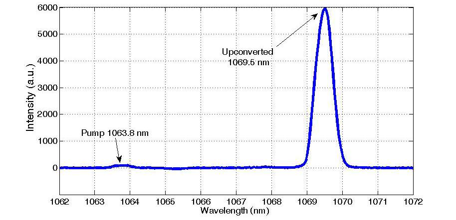 图2所示:上转换光的光谱。少量残余泵光@1063.8 nm时,而在1069.5nm处出现了一个强峰值,对应于这个差值正是泵浦红光和THz(1.5太赫兹)之间的频率差