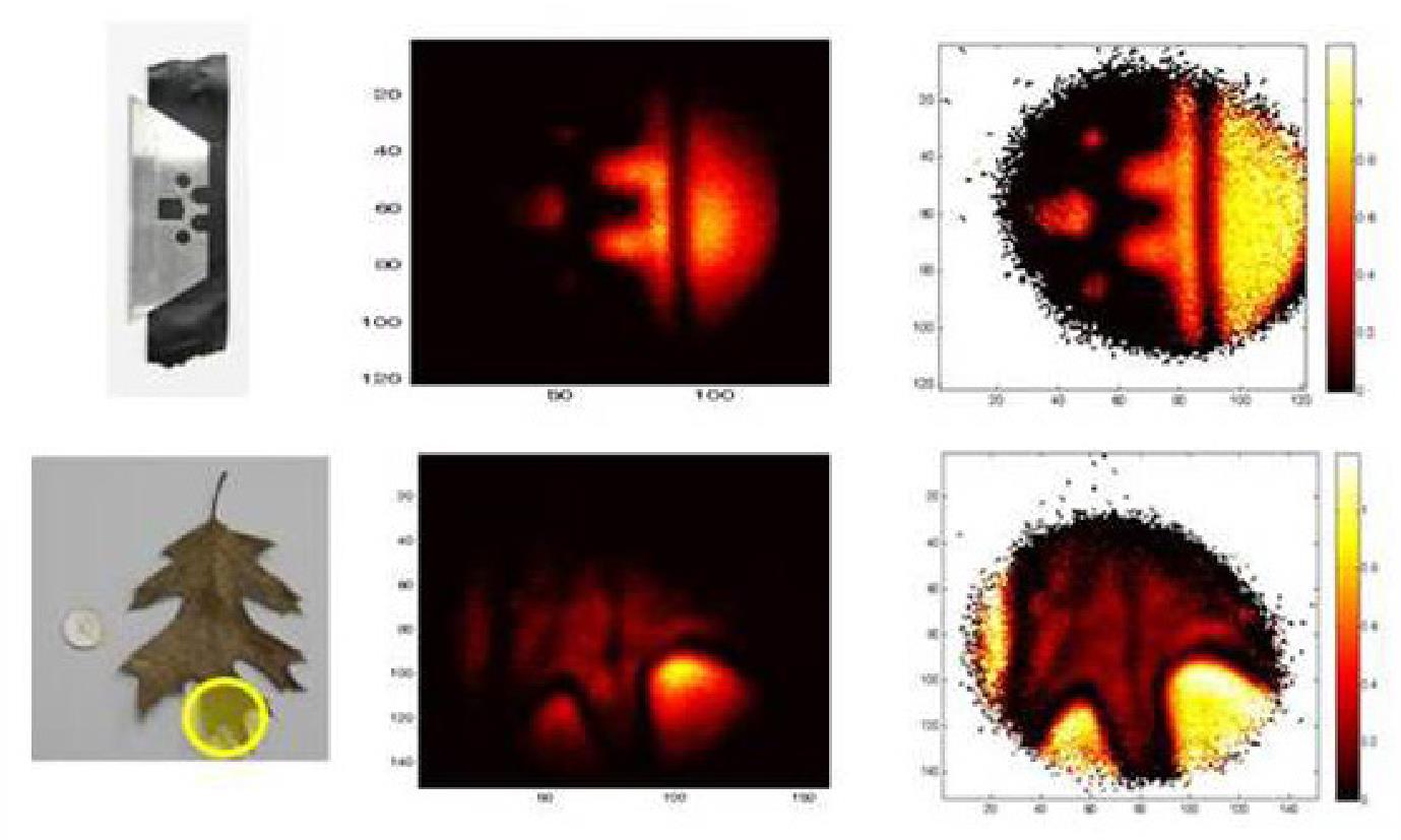 泵浦光束与上转换光束光谱分离的能力是该方法的关键因为它能在很少或没有图像处理的情况下实现快速成像。实时图像可以采取简单将一个物体置于THz光束中。如果光束的参考图像是在物体插入之前拍摄的,则对图像进行归一化处理,实现了对整个视场的相对传输量的真实测量时间。图3突出显示了系统的实时成像功能。左边的一列是对象和中心列显示没有图像处理的以8帧/秒拍摄的视频的一帧。在右边的柱,图像已经被光束的参考图像分割,该参考图像是在光束之前拍摄的视频。最上面一排显示了隐藏在电子胶带中的剃须刀片,这清楚地显示了它的穿透能力带子露出了金属刀片。第二行是叶子的传输图像,显示了其静脉结构。