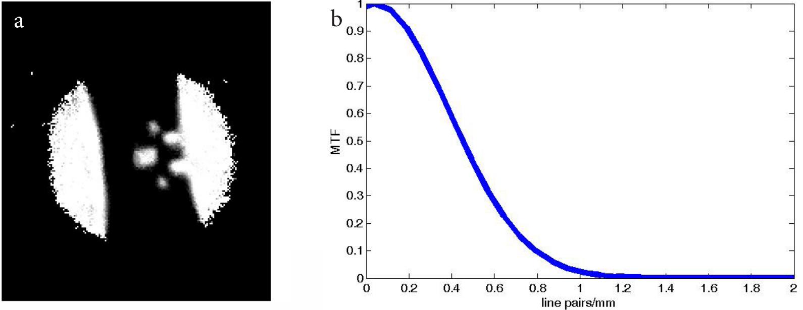 输出频率为1.5 THz是通过大气透射窗传播的理想频率。另外波长200um足以使得其分辨率分辨出大部分小物体。成像系统的调制传递函数(MTF)的测量使用倾斜边缘方法,成像如图4a所示。图4b中的MTF计算结果显示在0.5行对/处的值为0.4毫米,为毫米级的成像提供足够的对比度。