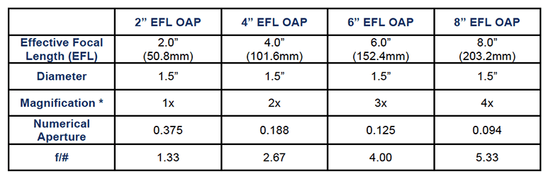 EQ-99X有4种不同的OAP选项。注意OAP组件的数值孔径(NA)应比单色器或分光计的入口NA略少。而F /#的OAP组件应比入口系统的F/#稍大,以有效地耦合到系统中。
