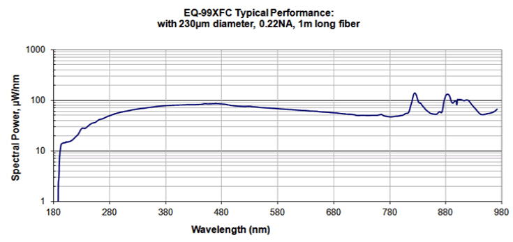 通常情况下,EQ-99 提供约10 mwatts/nm/mm?/sr的光谱辐射亮度(亮度)(取决于波长)和约0.5W总功率。