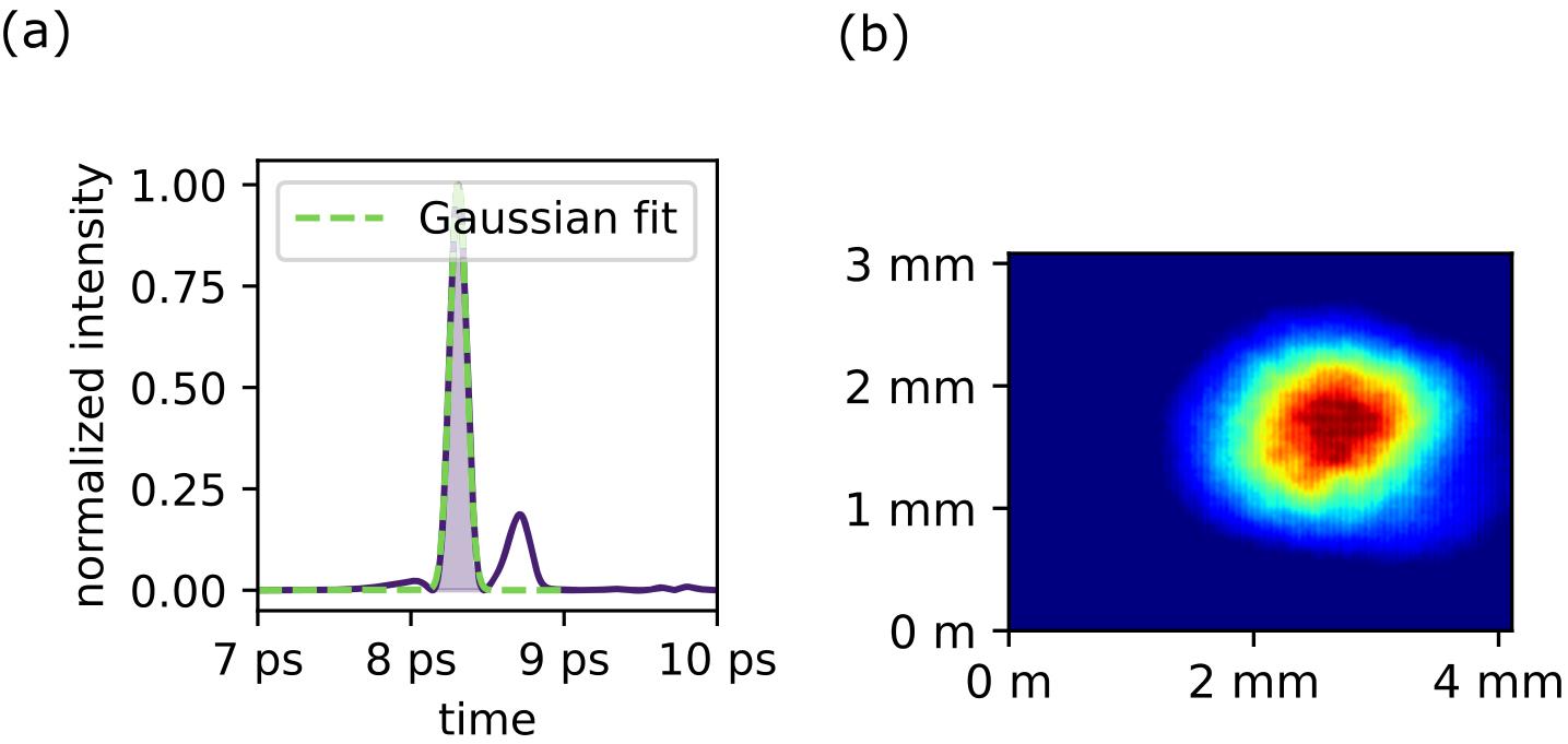 其中 Aeff是使用第二个抛物面镜焦平面中 1/e 2水平处的直径计算的有效面积,rTHz是半峰全宽 (FWHM) 的太赫兹脉冲持续时间。对于我们从 EOS 数据中得到的多周期轨迹 [见图4(a)],应估计主要半周期的峰值强度(公式中的 I THz )[参见图 5(a)中的虚线高斯拟合]. 此外,W THz表示该主峰的有效能量。计算出的半周期时间宽度约为 0.13 ps。图 5(b)显示了在 1/e 2直径水平 2.65 mm × 2.25 mm处第二个 OAP 反射镜焦点中的 THz 光斑。太赫兹电场强度由下式给出: