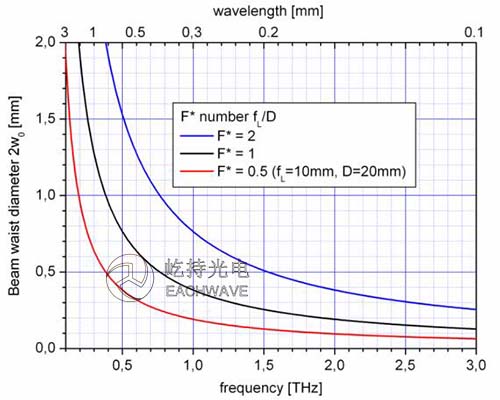 假设我们要分析的太赫兹光束为高斯型光束,那么我们就可以用通过下面公式来计算一块透镜对太赫兹光束聚焦后的束腰直径: