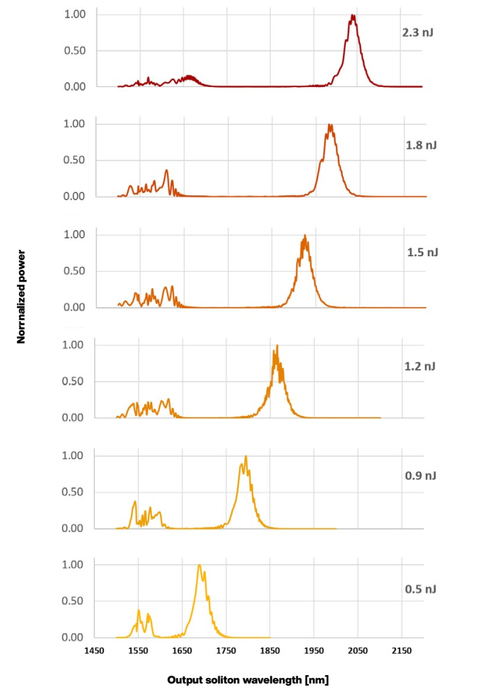 基于此,我们引入了SSFS非线性光纤,允许任何人将其1030 nm或1550 nm 飞秒激光器转换为波长可调光源,并具有非常宽的调谐范围。用户不必再成为光子专家,就能进行孤子光谱调谐,用户所需要做的就是将输入功率调高或调低,光谱就会魔法般在长度优化过的非线性光纤中频移。