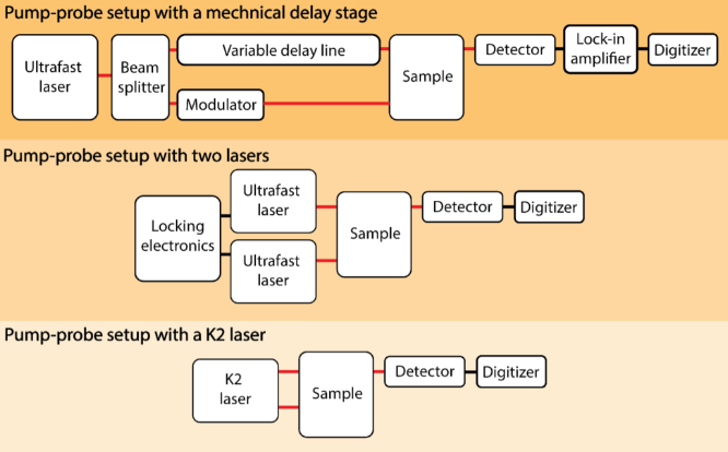 泵浦探针采样在材料科学和化学中特别有用,它可以帮助了解能量转移、光化学和其他重要过程的基本机制。有多种方法可以实现高性能泵浦探头测量系统。下图从概念上比较了获得最先进性能泵浦探针设置所需的元件。K2 Photonics 激光解决方案允许以最高性能获得泵浦探针测量的简单实现,使这种泵浦探针方法在实践中易于部署。