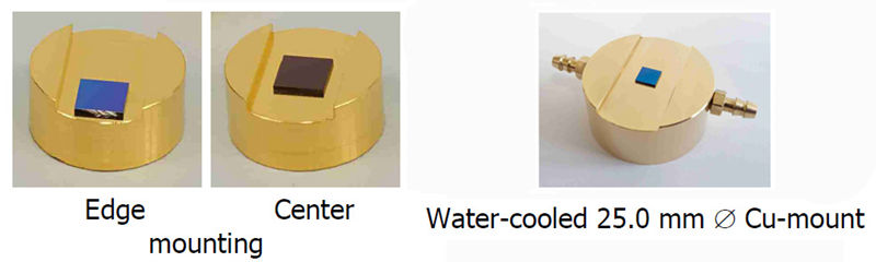 标准尺寸为4.0 mm x 4.0 mm和0.45 mm厚度的SESAM芯片中为了散热,必须将SAM粘接或焊接在铜散热片上。焊接具有最佳热导率,推荐用于平均光输出功率> 0.2 W情况下。我们提供12.7 mm(1/2“)、25.0 mm和25.4 mm(1”)的标准直径铜散热器。25.0 mm直径的散热片也可作为水冷版本使用。