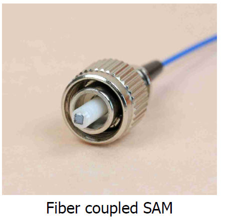 b、您可以订购光纤耦合SAM。在这种情况下,SAM安装到FC/PC接头的陶瓷套圈上,光路中没有任何胶水。您可以选择各种类型单模光纤,如HI-1060,PM 980(Panda),也可选择另一个光纤端口上的端口类型。我们的标准光纤长度为1m。最短的光纤长度为15cm。